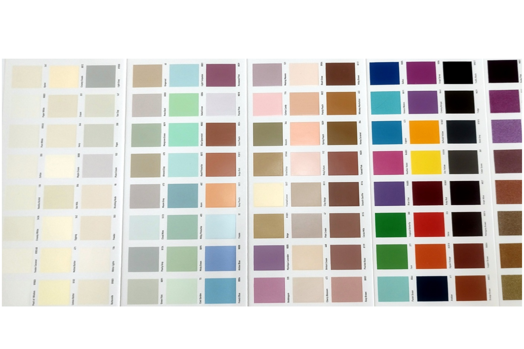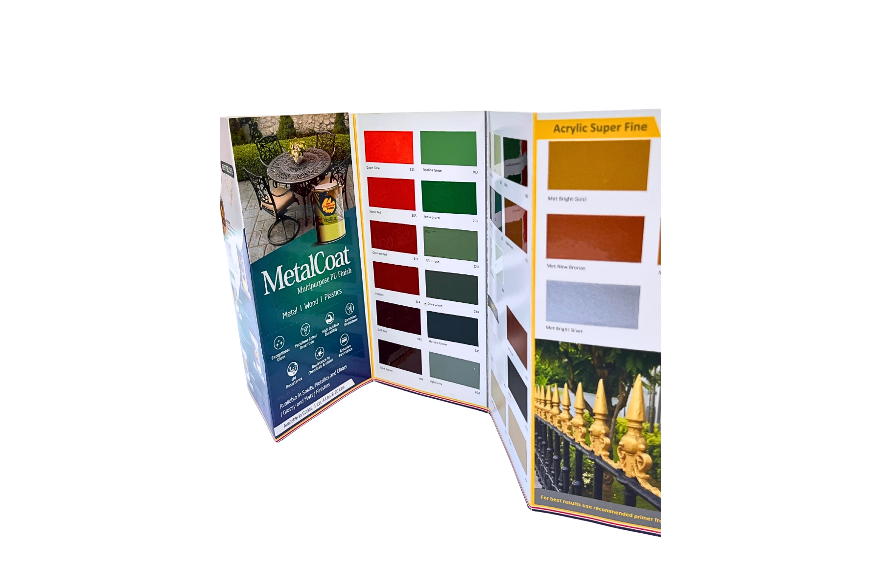 A handy shade card for general use in Auto, Furniture, Industrial and other industries to showcase colour offering including solid and metallic colours.